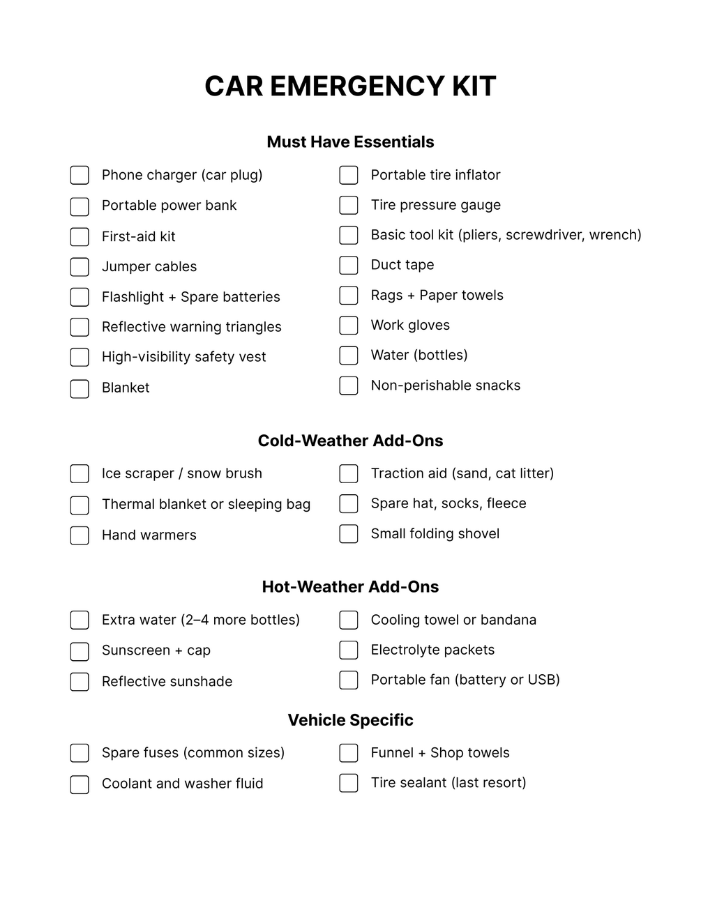 Print this free emergency car kit checklist and keep it in your glovebox. It’s one of the most important pages from the full 10-page Road-Ready Kit that helps you prepare your car for breakdowns, bad weather, and road trips. Download it free today and start building your kit.
